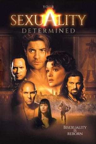 I was going to rewrite the movie tagline (The sands will rise. The heavens will part. The power will be unleashed.) to make it even more bisexual, but I’ve tried, and I’ve tried to find a version that isn’t just pure filth. So, use your imagination with bi abandon, something will rise, something will part, and something will be unleashed.