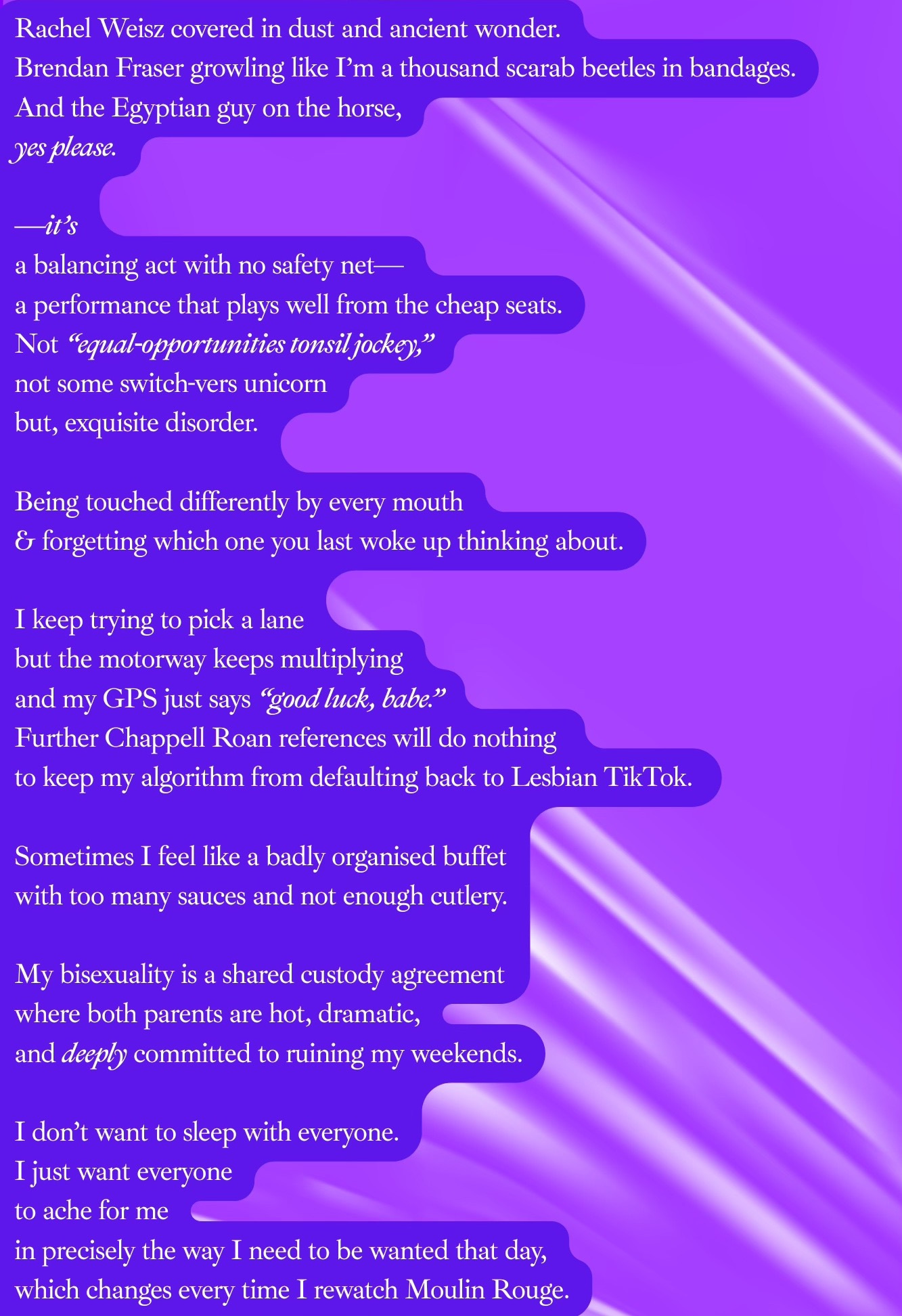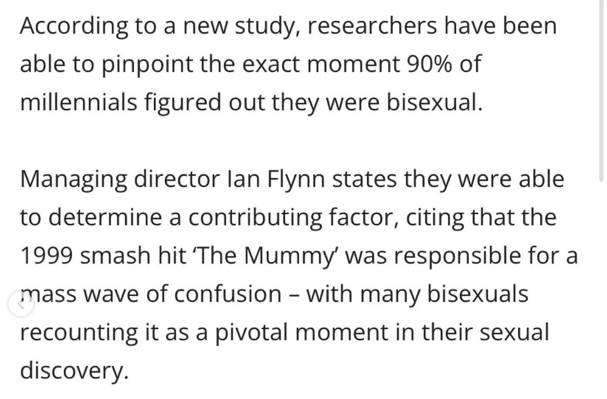 It has been announced, whispered through the vents of the internet on a hot desert wind carrying glimmer warnings / trauma / unresolved teenage longing, another film in The Mummy universe is coming, with the original cast / chemistry / biochemical weapon of potential mass bisexualisation, and suddenly an entire generation of emotionally literate, therapy-fluent, oat-milk-drinking elder millennial queers has collapsed back into the living room carpet of 1999, pupils dilated / palms sweaty / brain chanting yes yes yes yes, because we know what this means, we know what is about to happen to our bodies / timelines / carefully curated adult selves / respectable footnotes / bibliographies / mortgage spreadsheets, we know we are about to be spiritually waterboarded by nostalgia / desire / competence porn / dusty romance and we are welcoming it with open mouths (read: hearts), because this is not “just a film”, (how very dare you!) this is a mass reactivation event / stored bisexual memory being violently thawed / the archive opening itself and screaming / chaotic academia at its finest / cultural theory in linen shirts & leather accessories / queer historiography peering over its reading glasses, this, this, is the moment when we finally, finally become whole, when the last straight person on earth will accidentally feel something shift during an intimate sandstorm scene and whisper “oh… oh no…”, because yes, yes, yes we are about to convert the world, gently, thirstily, respectfully, with salty & sweet popcorn and communal panting, and Brendan Fraser alone now holds this power like a benevolent bisexual demigod, capable of reorienting global desire with a single smirk and a well-timed growl, and the cinemas are woefully underprepared, the seats are not waterproof, the drainage systems are insufficient, Ofcom should be alerted, because we are coming, dehydrated / desperate / scholarly / feral, clutching our reusable cups and our unresolved feelings, ready to be drenched in memory / meaning / moist-eyed reverence, ready to scream internally about how this franchise shaped our entire understanding of attraction, multiplicity, longing, and aesthetic devotion, ready to admit that no, we never recovered, we simply learned how to carefully cite our trauma.