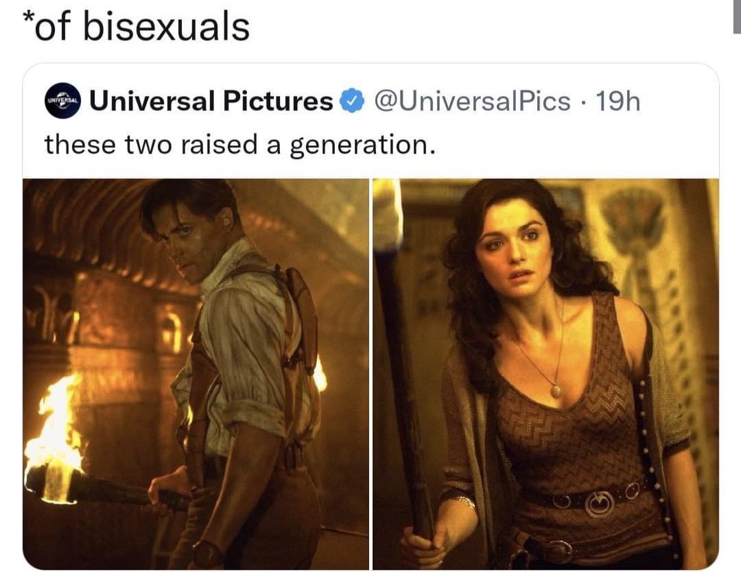 Evelyn. Look, she may not be an explorer, or an adventurer, or a treasure-seeker, or a gunfighter, but she is proud of what she is. Yes. She. Is. A. LIBRARIAN. Genius, one woman catastrophe in sensible shoes. The woman who made half of us realise that intelligence can be erotic, that clumsiness can be charming, that glasses can be a weapon, that you can drop an entire bookshelf and still be the smartest person in the room. She was a divine lesson in loving women who know things, women who read, women who think, women who argue, women who grow into power without losing softness, women who can translate ancient languages and still flirt in the romance of ancient candlelight. She gave us permission to desire brilliance. She gave us permission to be brilliant and desirable. She gave us permission to be both & all (but mostly both, for the continued sake of my argument here). She is returning, older, sharper, more luminous, and every bisexual who ever fell in love with a teacher, a librarian, a poet, or a woman explaining something passionately is about to relapse. English teachers are not safe.