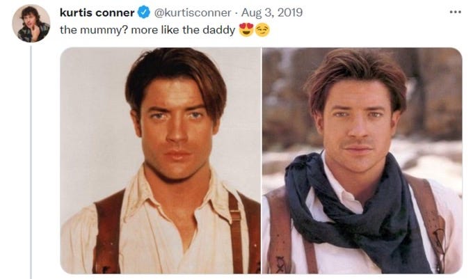 Let us begin with the original offender. Rick O’Connell. Ugh, that man. Carefully orchestrated bit of late-90s scruff, Brendan Fraser. Emotionally available in unbearably long bursts. Wearing that linen shirt as if it was stitched directly (tightly, and ever so rightly) onto the collective queer unconscious like a patch on a Fjällräven backpack, and then saddled with a leather harness (save a horse, yadda yadda…). This man single-handedly taught us that masculinity could be brave & soft & funny & terrified & loyal & sweaty & still deeply attractive, that you could rescue someone and also listen to them, that you could scream in the face of mummies and still respect a woman’s intellect, that you could be a himbo with a soul. And for many of us this was the first time we realised that our desire did not sit neatly in one box, that we could want strength & tenderness & chaos & safety in the same body, that attraction could feel like admiration & laughter & panic & reverence all at once, and now he is coming back, older, warmer, deeper, with supreme dad-energy and cultural sainthood, and we are simply not strong enough for this second wave, we are about to be emotionally reset to factory settings, updated to a new operating system, and have all our apps frivolously toggled.