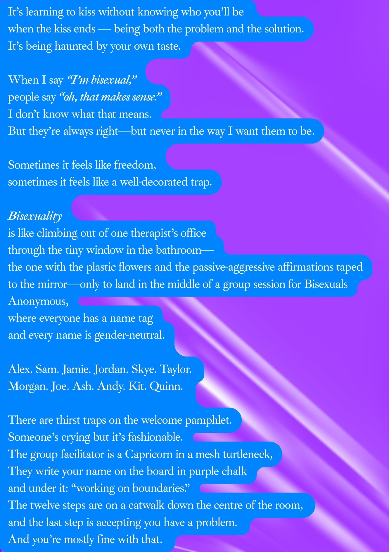 In the week that Pedro Pascal was intimately photographed potentially dating a man, and the tabloid response being “is he gay?”, I thought I would share something explicitly bisexual to counteract a little of the bi erasure in the world.